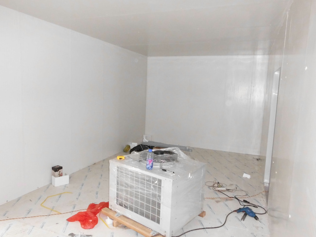 制冷系統(tǒng):該0~5℃的保鮮冷庫制冷系統(tǒng)采用的是1套3匹丹佛斯箱式中高溫側(cè)出風(fēng)渦旋制冷機組;另外-18℃的冷凍庫制冷系統(tǒng)采用1套5HP丹佛斯箱式低溫側(cè)出風(fēng)渦旋制冷機組壓縮機,該機組制冷量大,性價比高,安全可靠。同時,冷庫內(nèi)配備2臺上海庫迪DD系列高效強風(fēng)型冷風(fēng)機,使得庫內(nèi)降溫速度快,快速對流循環(huán),從而達到每個角落的溫度均勻性。